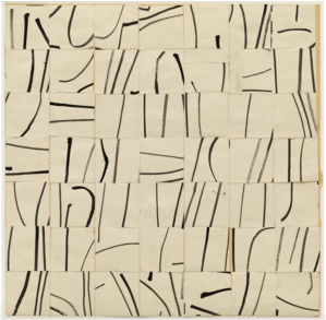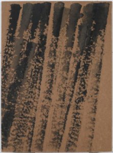 It looks like something could be written in space. Pierrette Bloch is described as using “Poor materials” as besides these horsehair drawings, she is often using ink on found paper or cardboard. She is also very sparse in her mark-making, and very repetitive, using repeated dots, lines or hyphens. I feel that, because she is not “elevating” the marks she makes to a painting, or a fancy drawing on thick paper with an expensive frame- they transport more a message of being a written note, a message or a musical chord, that seems like it should be easily readable, but then has the intriguing elusive quality of only being understood by the artist herself.