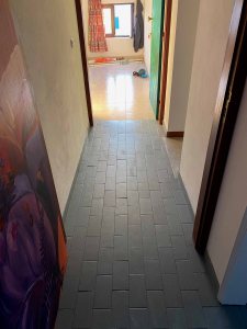 The space is a long, narrow corridor with strange angles and different heights of the ceiling. I have previously painted all the walls white. I will start this project by also covering the rather disturbing tiles. They are not strange enough to be interesting, but are very distracting.