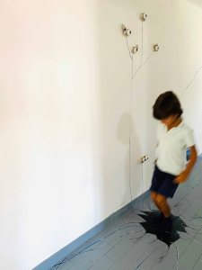 So I aim at combining trompe l’Oeil painted elements, with elements drawn in wire and light, as well as connecting lines.