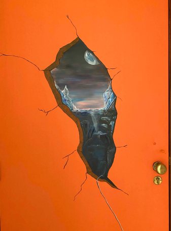 On the yellow door, the hole will open up to wonderfully lush nature, Paradise, or fairy land. The orange, second door will crack open to darkness and chaos, maybe Hell. Thus between the two, there will be balance again.