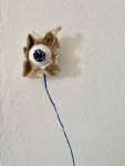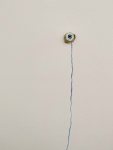 Finally, I connect it to the hole in the ground with the same blue thread that connects the eyes. It is unclear if an eye is attached and has crawled into the opening.