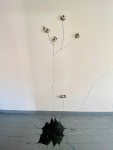 For this site-specific installation, I set the objective to create work with a rhythm, a narrative and elements of spontaneity. I am happy that I managed to not overcrowd the space and I do believe the different elements , the spaces in between and the swinging lines that connect them create a harmonious rhythm. I also stayed within a narrative- connecting symbolical elements of spirituality and religion. Spontaneity was definitely a big part of the work- one element led to the next and they were all conditioned by the peculiar shape of the space of this installation.