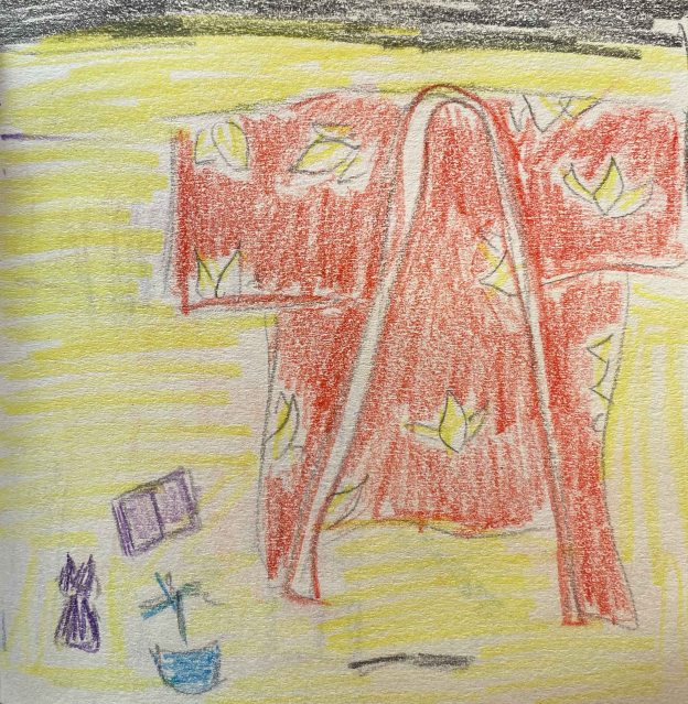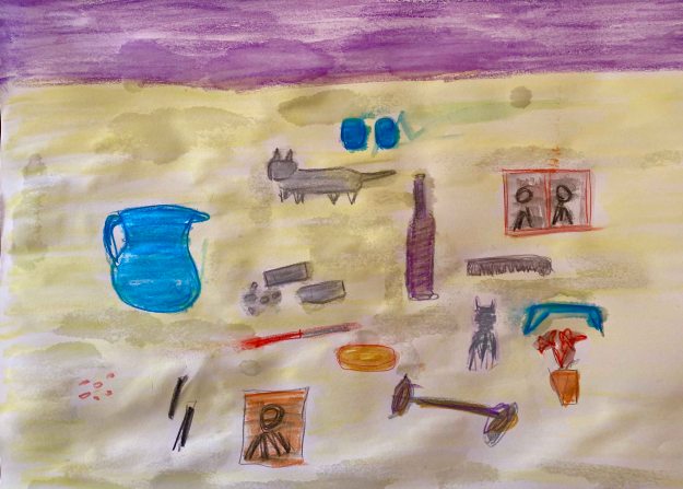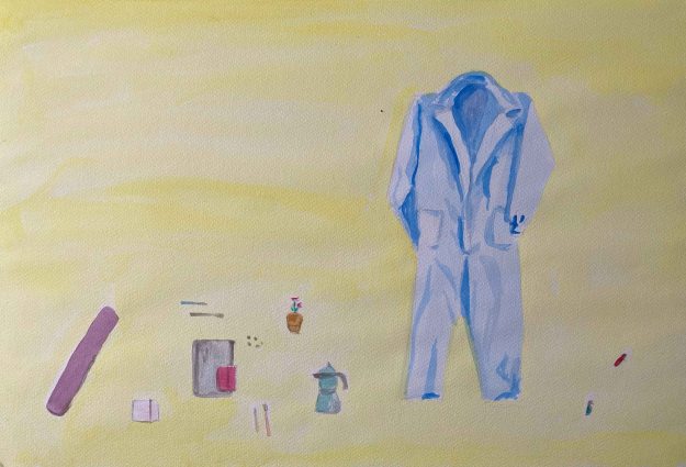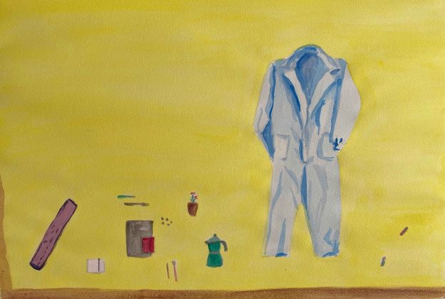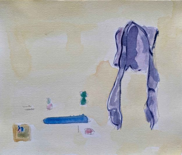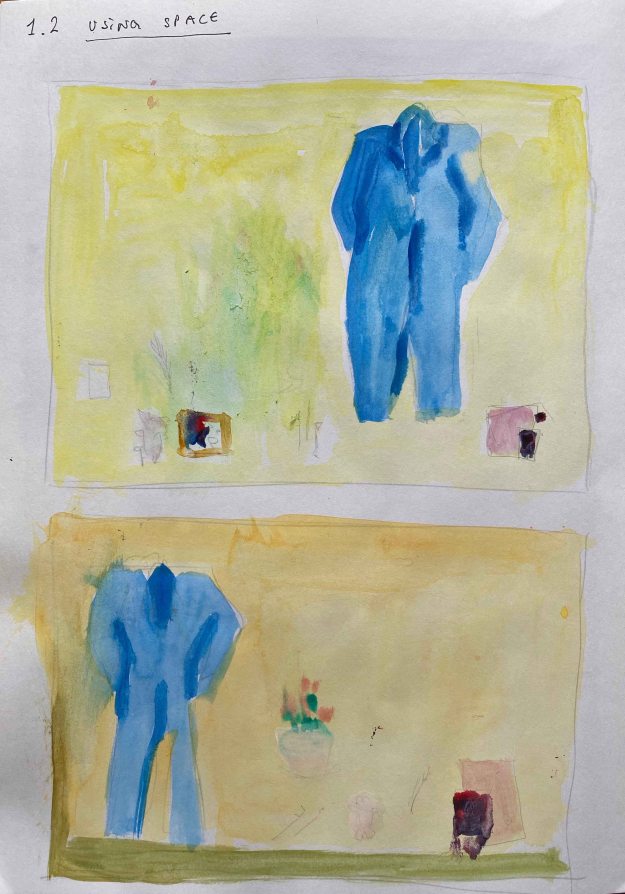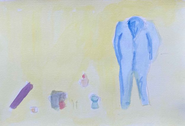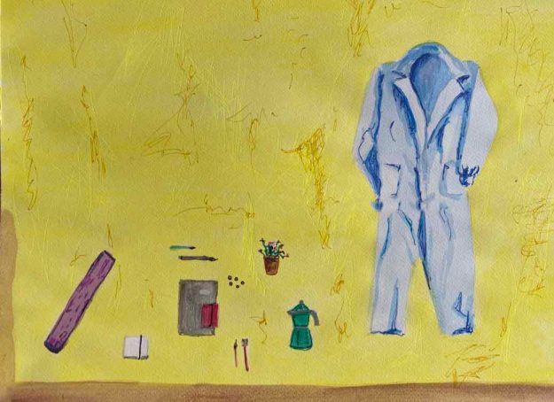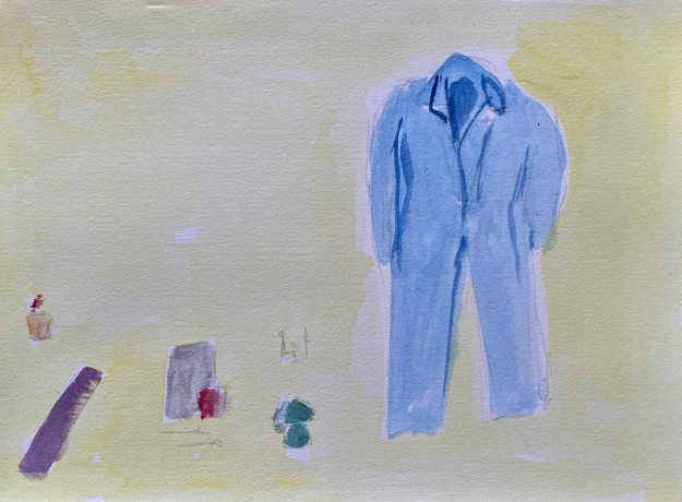 I have added other objects that are meaningful to me- my yogamat, the espressomaker, a small plant, brushes and sketchbooks. I find the purple west interesting but too unclear a shape and decide to explore the version with the blue overalls: