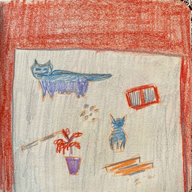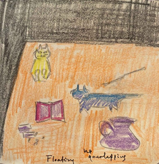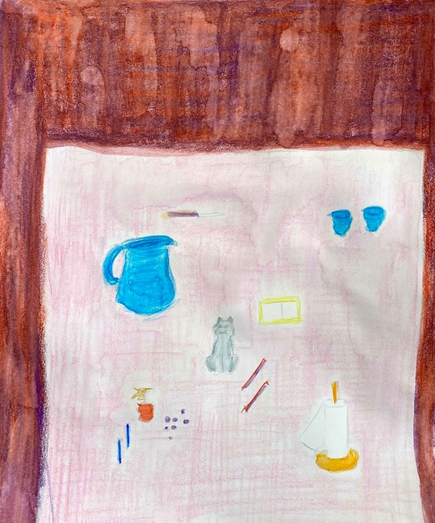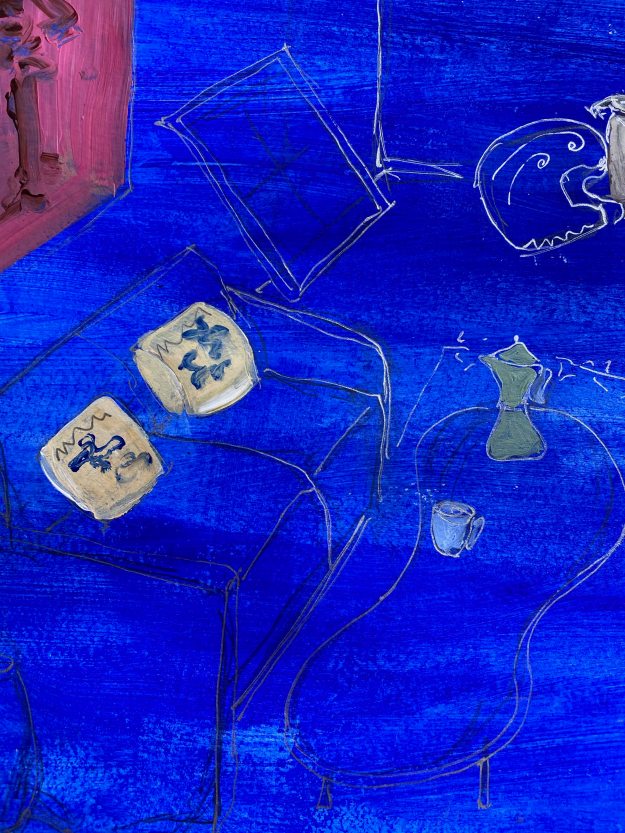 I think it is quite clearly inspired by Elisabeth Blackadder’s paintings, with the objects floating freely in a field without depth. I am still really unsatisfied with this drawing and launch into a final trial directly on the A2 paper, following my initial trials in the small sketchbook while still in France.