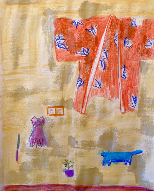 The image to the right has two layers of paint for brighter colours, more detail and I added a brown line to give it all some hold- something I observed in one of Blackadder’s kimono paintings.