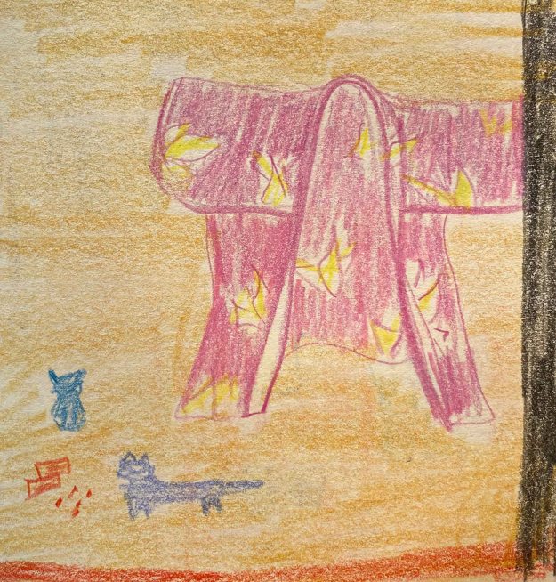 I am currently on an unplanned visit with my mother, so I start exploring different compositions in my small pocket sketchbook, by looking around for interesting objects. I think Elisabeth Blackadder would have found a lot of material here, my mother being somewhat of a collector too. They also share an interest for anything Japanese and cats.