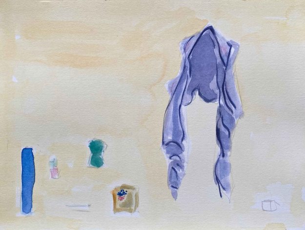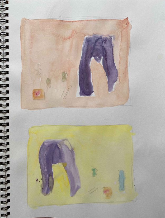 I liked several of the compositions with the kimono above and am continuing the idea of a larger clothes item dominating the image. I chose two for trials- a sloppy purple west and my blue winter painting overalls and start with some compositions in Lascaux Aquacryl in my A4 sketchbook.