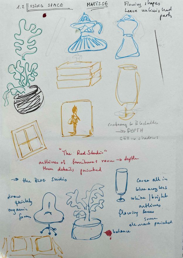 I start by looking at the line and shapes Matisse is using, while using items from my own surroundings.