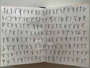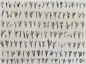 The various shapes of grass presented like this in the form of a chart, become a new alphabet, a new language. I refine the shapes in a drawing on A4, in Indian ink: