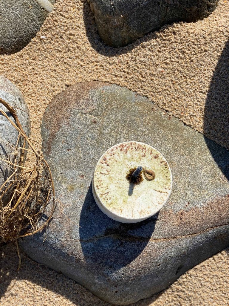Washed up on the sand, a mixture of man made debris and sticks and stones form new drawings: