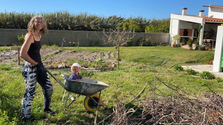 I carry loads and loads of wheelbarrows with sticks from our storage in the outside kitchen to the nesting site. (Trying not to think of how much effort it just took us to store them there before I had this idea to tear them out again.)