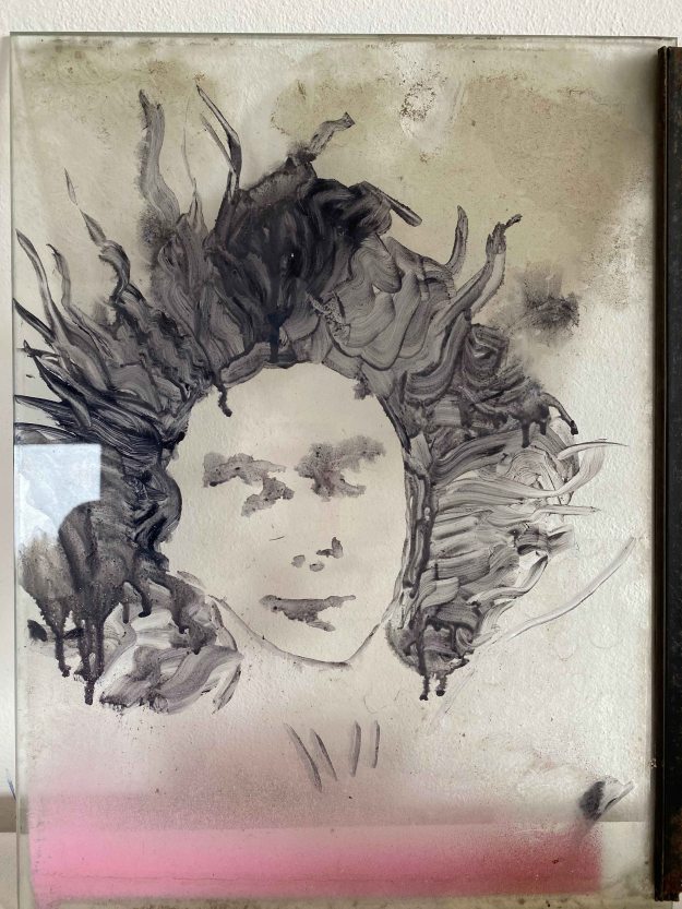 Letting my daughter and the little One wear the lampshades on their heads is a way I find to speak about a lot of the feelings coming up in these times. There is the feeling of not seeing where we are going, or even standing in front of a wall. There is an element of hiding as well. In one motive, my daughter poses nude, emphasizing the vulnerability of the now. In the other, where I photoshop my daughter and granddaughter together before painting them, they are wearing the soggy casual sweatpants that I see almost every day.